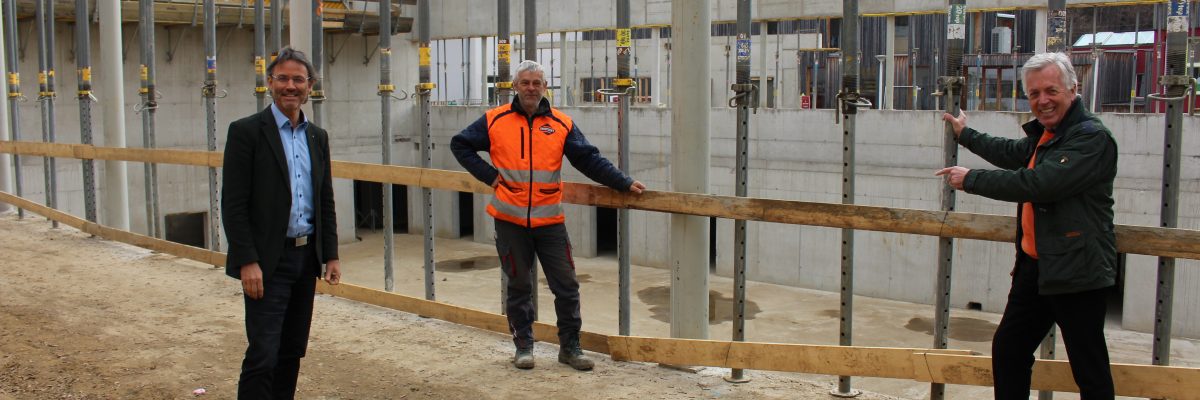 Die Bauarbeiten gehen zügig voran. „Ich freue mich sehr, dass die bauausführende Firma Switelsky mit vollem Einsatz baut. Die Halle wächst. Das ist ein Jahrhundertprojekt“, sagt Bürgermeister Herbert Gaggl.