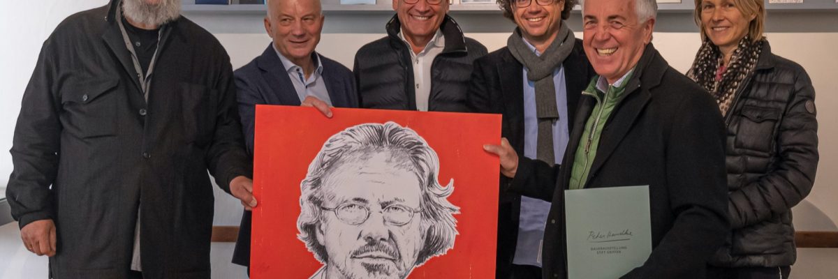 Bürgermeister Herbert Gaggl, Vizebürgermeister Roland Gruber sowie der Präsident des Vereins ZUMGLUECK.JETZT Arnold Mettnitzer, der Künstler Harald Schreiber sowie die Architektin und Glücksprojektorganisatorin Gordana Brandner-Gruber haben sich dafür bedankt und das von Harald Schreiber gezeichnete Portrait, das Teil unseres Glücksparcours in Moosburg ist, als Geschenk dem Peter Handke Museum übergeben.