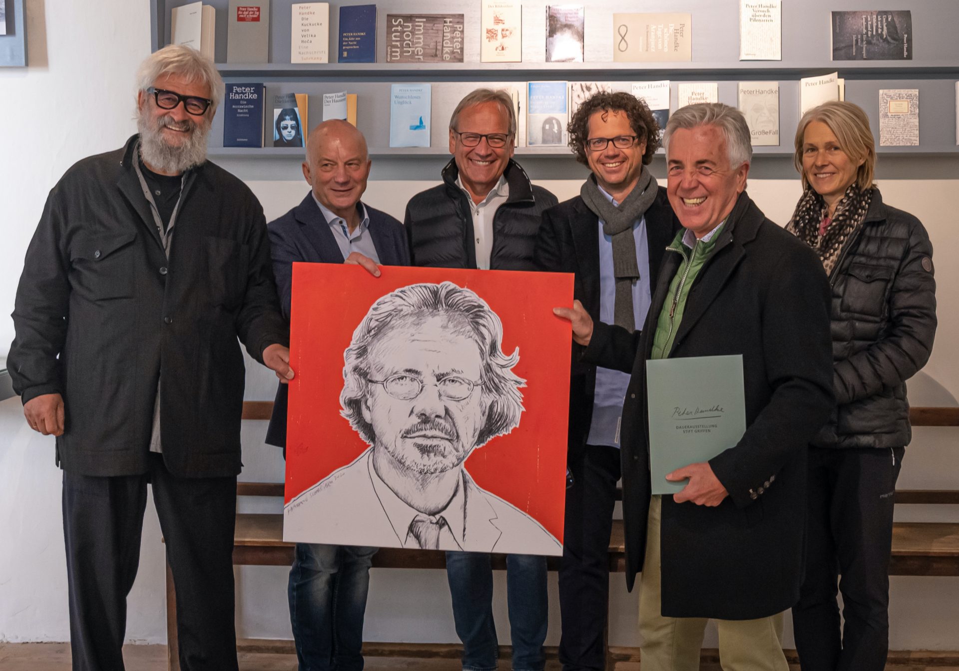 Bürgermeister Herbert Gaggl, Vizebürgermeister Roland Gruber sowie der Präsident des Vereins ZUMGLUECK.JETZT Arnold Mettnitzer, der Künstler Harald Schreiber sowie die Architektin und Glücksprojektorganisatorin Gordana Brandner-Gruber haben sich dafür bedankt und das von Harald Schreiber gezeichnete Portrait, das Teil unseres Glücksparcours in Moosburg ist, als Geschenk dem Peter Handke Museum übergeben.
