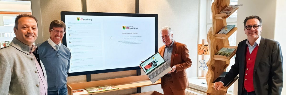 Andreas Lanner (Lanmedia), Walter Fox (Pixelpoint), Bgm Herbert Gaggl und AL Norbert Pichler (vl) präsentieren die digitale Amtstafel