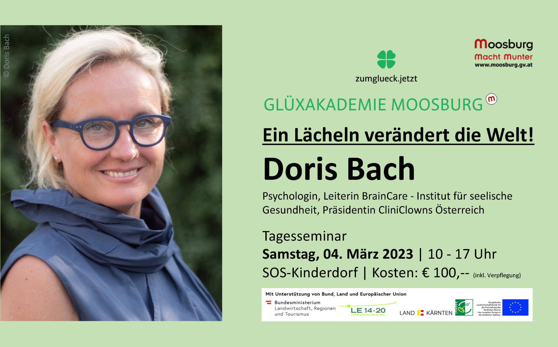 Am 4. März 2023 findet ein Top-Ganztags-Seminar mit der renommierten Psychologin Dr. Doris Bach, Leiterin von BrainCare, dem Institut für seelische Gesundheit und Präsidentin der CliniClowns Österreich im Rahmen der Glüxakademie Moosburg statt.