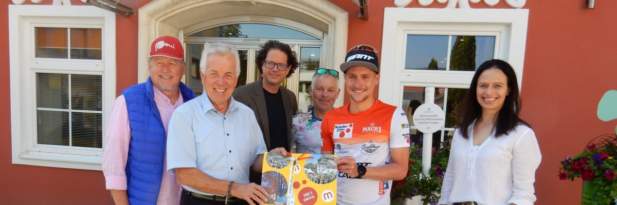 Bgm Herbert Gaggl, Vizebürgermeisterin Astrid Brunner, Vizebürgermeister Roland Gruber und Quartiergeber Hubert Sickl wünschen dem sympatischen Athleten alles Gute für den spannenden Bewerb am Sonntag und werden ihn am Kirchplatz – vor dem Klima-Fitnesscenter beim Radlerfrühstück – anfeuern.