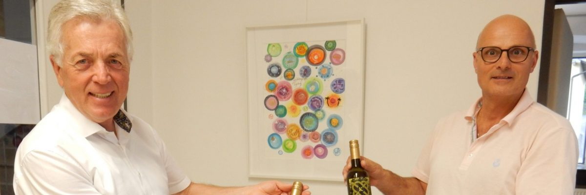 Voll Stolz konnte Robert Mack, auch in Vertretung seines Winzerkollegen, Gerfried Pink, unserem Bürgermeister, Herbert Gaggl, die ersten Flaschen der Ernte 2020 überreichen.