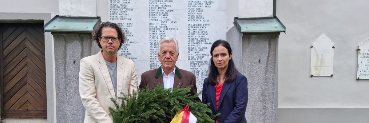 LAbg Bgm Herbert Gaggl, Vzbgm Astrid Brunner und Vzbgm Roland Gruber gedachten vor dem Kriegerdenkmal in Moosburg aller Moosburgerinnen und aller Moosburger und aller Frauen und Männer, die in beiden Weltkriegen ihr Leben verloren haben sowie der Volksabstimmung vom 10. Oktober 1920.