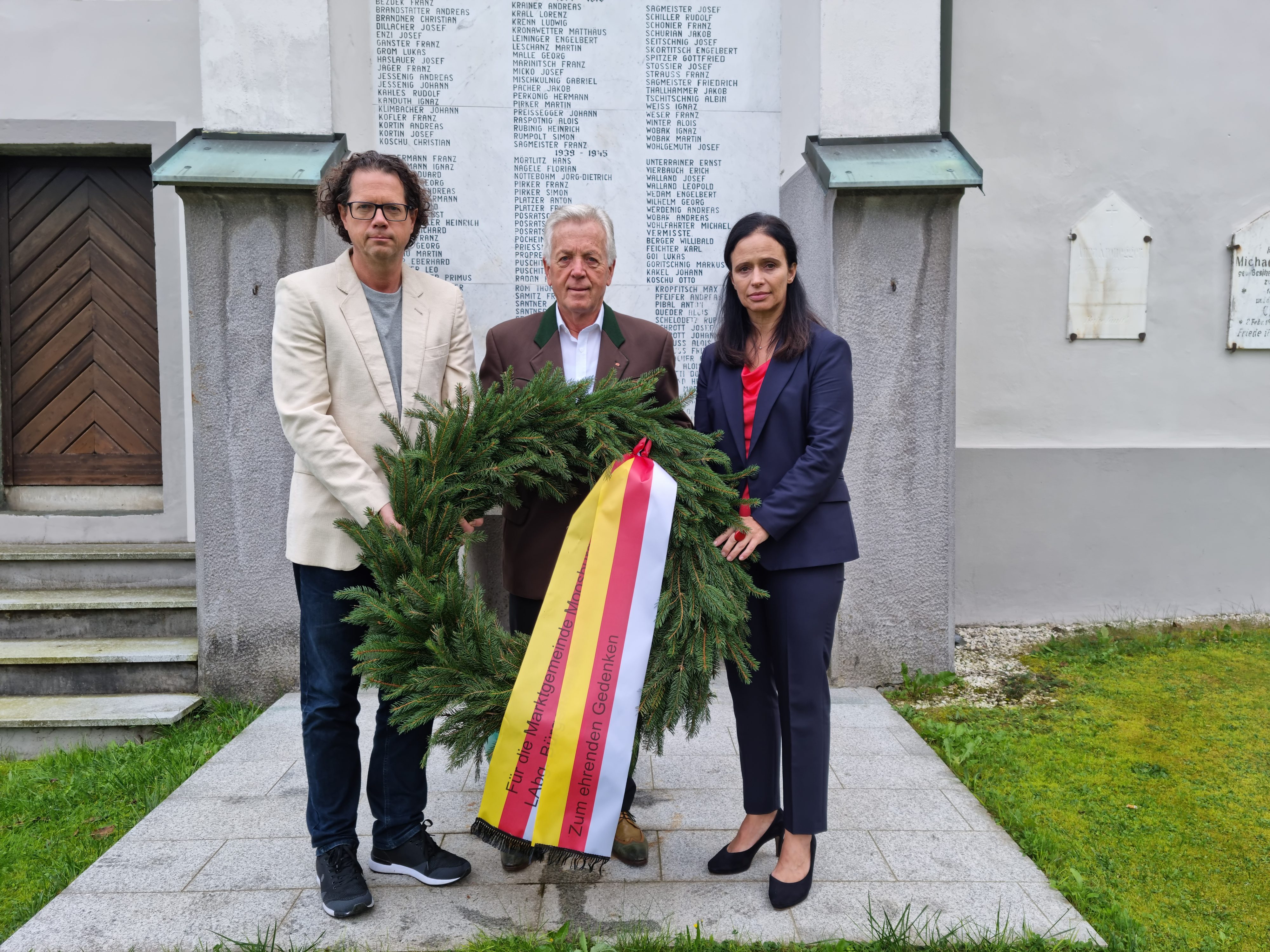 LAbg Bgm Herbert Gaggl, Vzbgm Astrid Brunner und Vzbgm Roland Gruber gedachten vor dem Kriegerdenkmal in Moosburg aller Moosburgerinnen und aller Moosburger und aller Frauen und Männer, die in beiden Weltkriegen ihr Leben verloren haben sowie der Volksabstimmung vom 10. Oktober 1920.