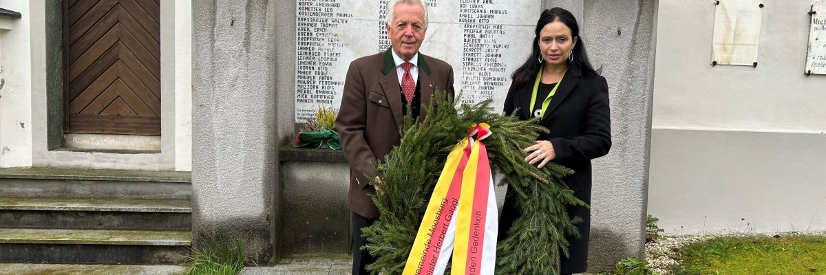 Anlässlich des 10. Oktober gedachten Bürgermeister Herbert Gaggl und Vizebürgermeisterin Astrid Brunner der gefallenen Moosburger, der Opfer der beiden Weltkriege und des Kärntner Abwehrkampfes und legten einen Kranz beim Denkmal in Moosburg nieder.