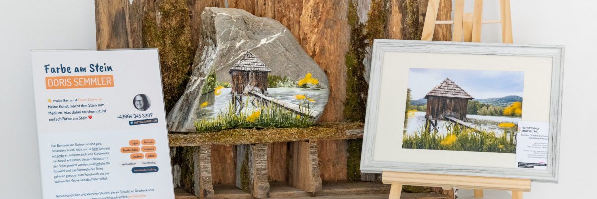 Moosburger Unternehmerinnen zeigen wie gelungene Kooperation aussehen kann. Die herrliche Moosburger Naturlandschaft ist nicht nur für Frau Sandra Matanovic (Hochzeitsfotografin Kärnten) ein beliebtes Motiv. „Neben der Hochzeitsfotografie finden beispielsweise immer mehr Familienshootings in Moosburg statt“ so Matanovic. Frau Doris Semmler (Farbe am Stein) hat Matanovic´s Foto vom Dammhäuschen in liebevoller Handarbeit auf einen Stein gemalt. Damit zeigt sie sehr erfolgreich, dass auch das Bemalen eines Portraits am Stein für sie keine Herausforderung ist. Dieses Unikat und noch viele weitere Kunstwerke von Frau Semmler sind u.a. in der Postfiliale Moosburg erhältlich. Frau Nicole Ogertschnig von der Postfiliale ist es eine Freude neben der üblichen Postgeschäfte auch regionale Produkte (z.B. Karolinger Wein „Zum Glück“) des täglichen Lebens für ihre Kundinnen und Kunden anzubieten.