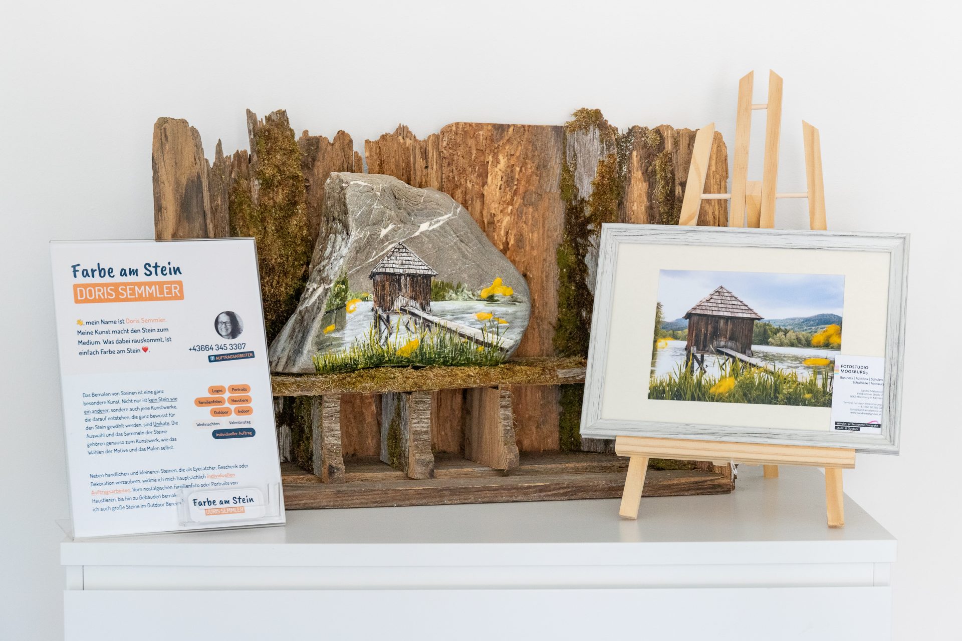Moosburger Unternehmerinnen zeigen wie gelungene Kooperation aussehen kann. Die herrliche Moosburger Naturlandschaft ist nicht nur für Frau Sandra Matanovic (Hochzeitsfotografin Kärnten) ein beliebtes Motiv. „Neben der Hochzeitsfotografie finden beispielsweise immer mehr Familienshootings in Moosburg statt“ so Matanovic. Frau Doris Semmler (Farbe am Stein) hat Matanovic´s Foto vom Dammhäuschen in liebevoller Handarbeit auf einen Stein gemalt. Damit zeigt sie sehr erfolgreich, dass auch das Bemalen eines Portraits am Stein für sie keine Herausforderung ist. Dieses Unikat und noch viele weitere Kunstwerke von Frau Semmler sind u.a. in der Postfiliale Moosburg erhältlich. Frau Nicole Ogertschnig von der Postfiliale ist es eine Freude neben der üblichen Postgeschäfte auch regionale Produkte (z.B. Karolinger Wein „Zum Glück“) des täglichen Lebens für ihre Kundinnen und Kunden anzubieten.