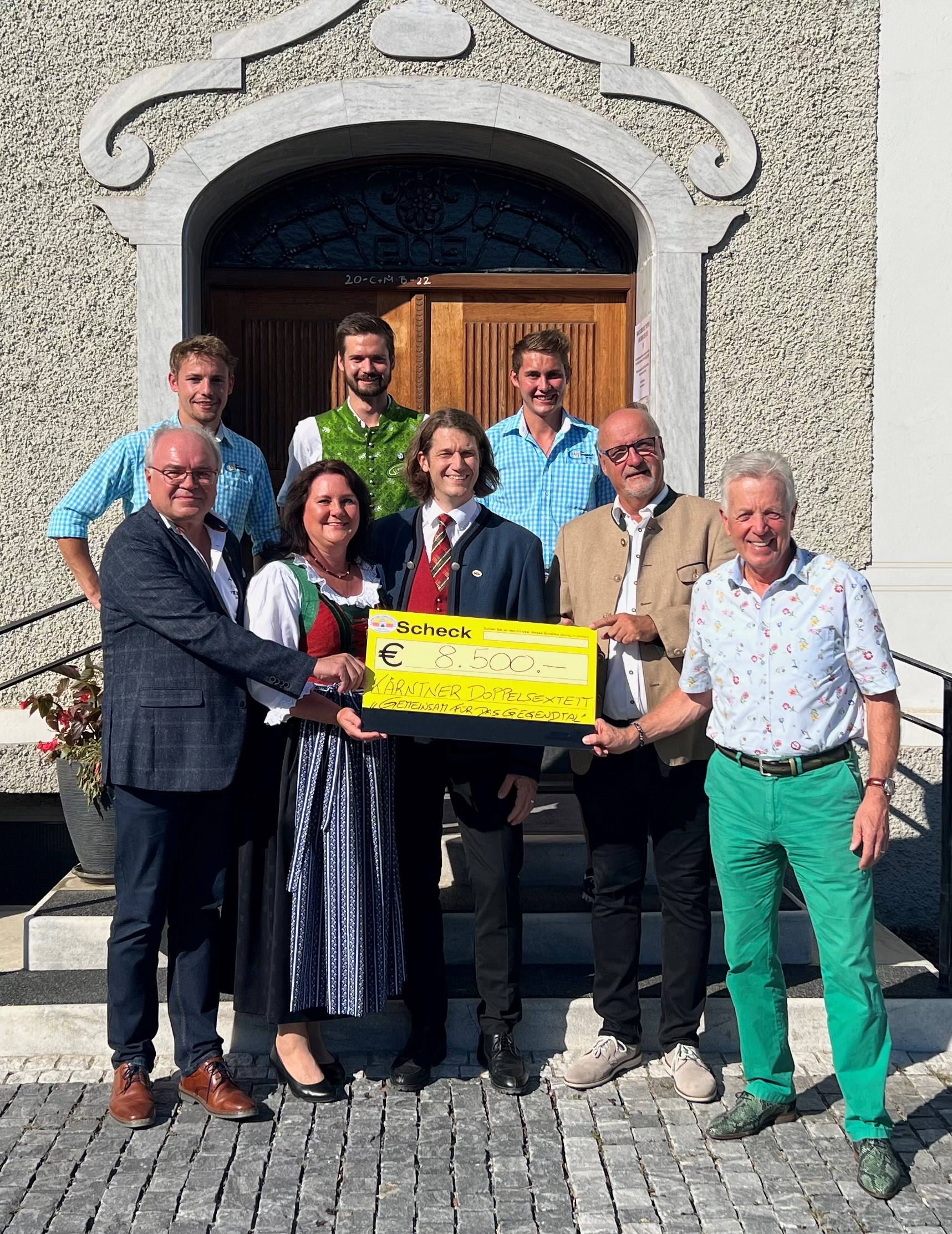 Das Benefizkonzert wurde gemeinsam mit dem Doppelsextett Kärnten, der Landjugend Arrich und unter Mithilfe der Marktgemeinde Moosburg organisiert. 8.500 Euro wurden eingenommen und kürzlich übergeben. Foto vl.: 1. Vzbgm. Gerhard Findenig (Arriach), Obfrau Margit Petutschnig, Obmann Bernd Lesacher, Bgm. Klaus Glanznig (Treffen), Bgm. Herbert Gaggl (Moosburg) und Mitglieder der Landjugend Arriach.