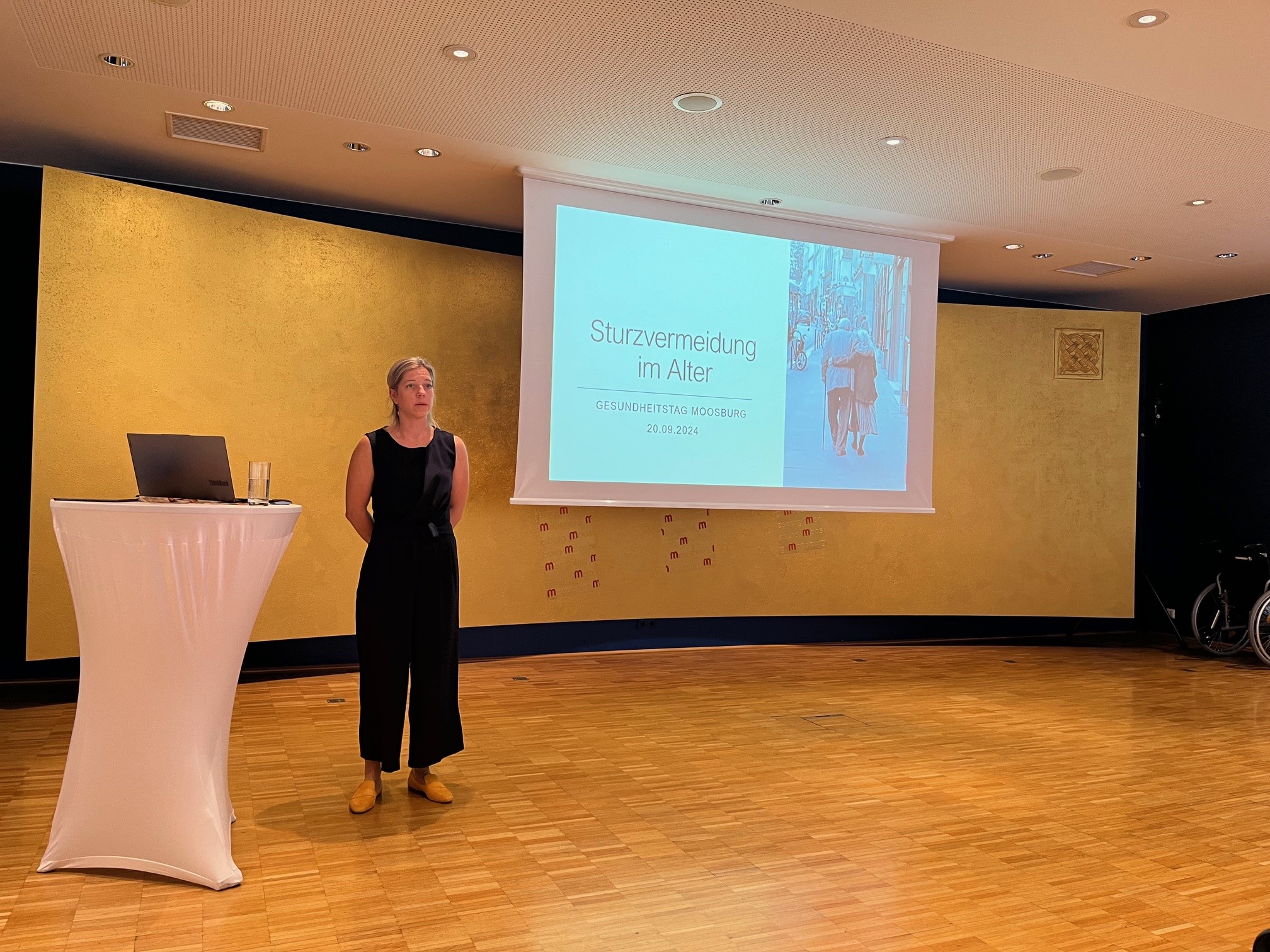 Zeitgleich fand auch der Vortrag über Sturzprävention im Alter statt. Die Physiotherapeutin Frau Katrin Reichstamm MSc berichtete, dass über 90% der Stürze im Haushalt passieren und das Frauen ein höheres Sturzrisiko haben als Männer. Sie regte an, Übungen in den Alltag einzubauen, um Stürzen vorzubeugen.