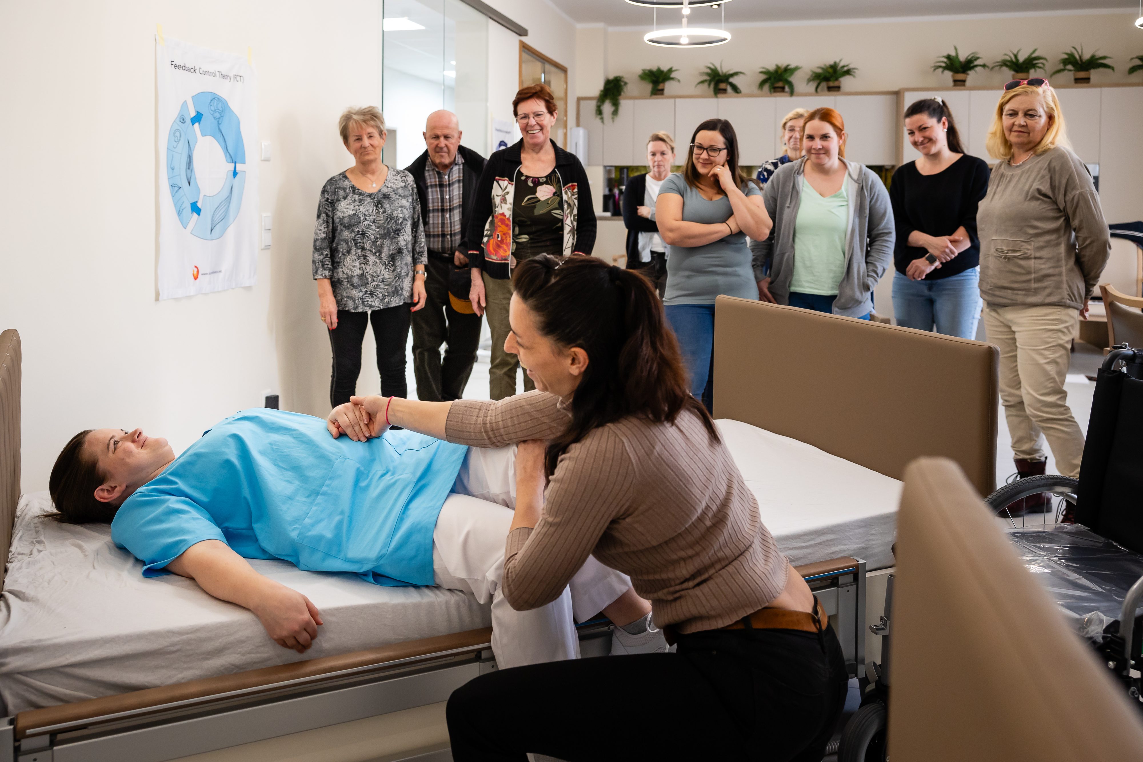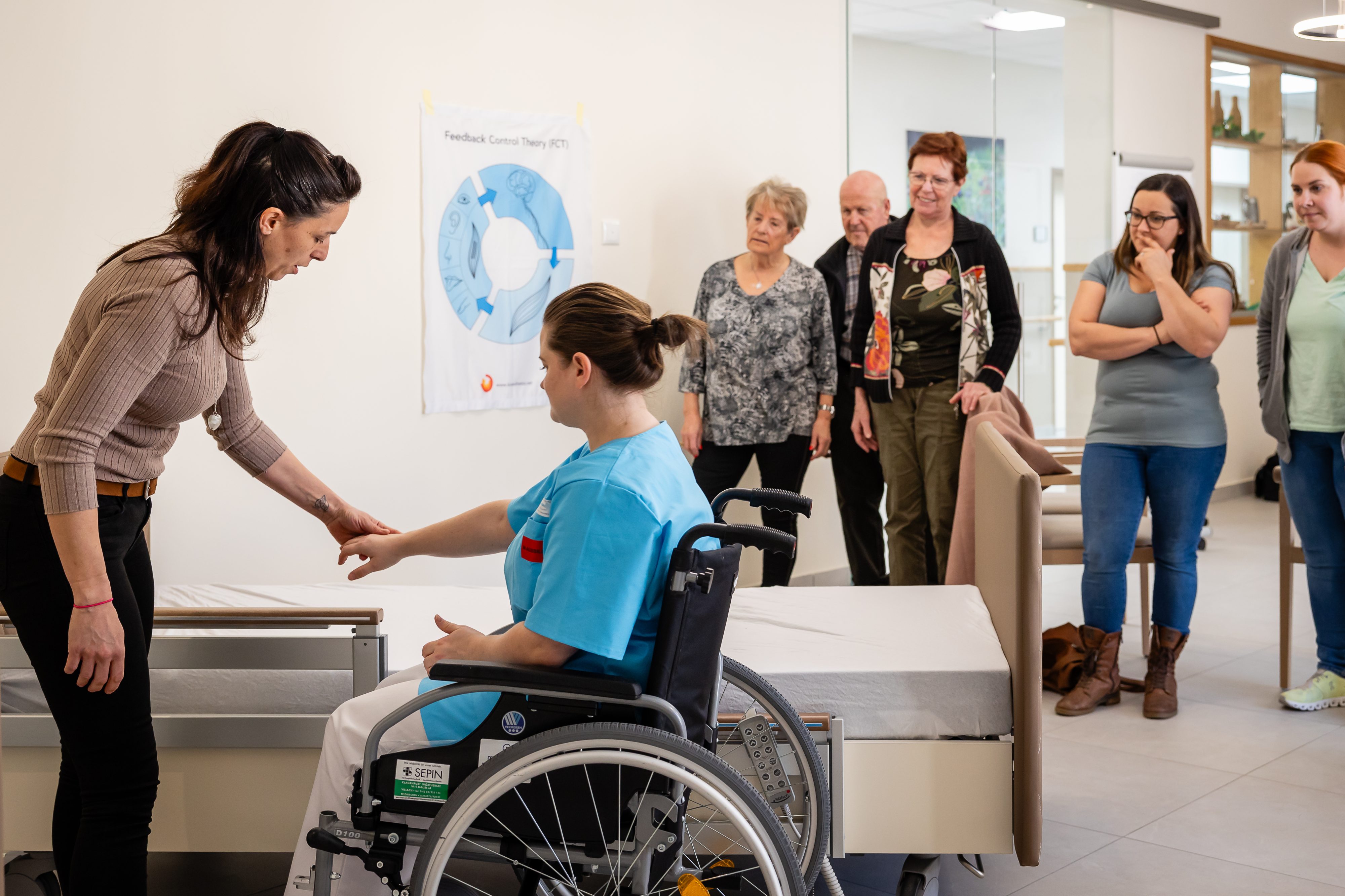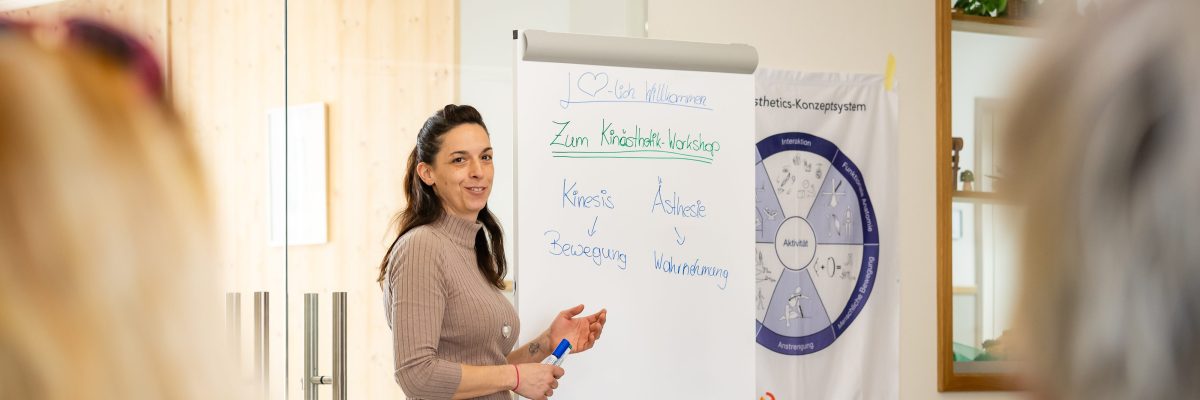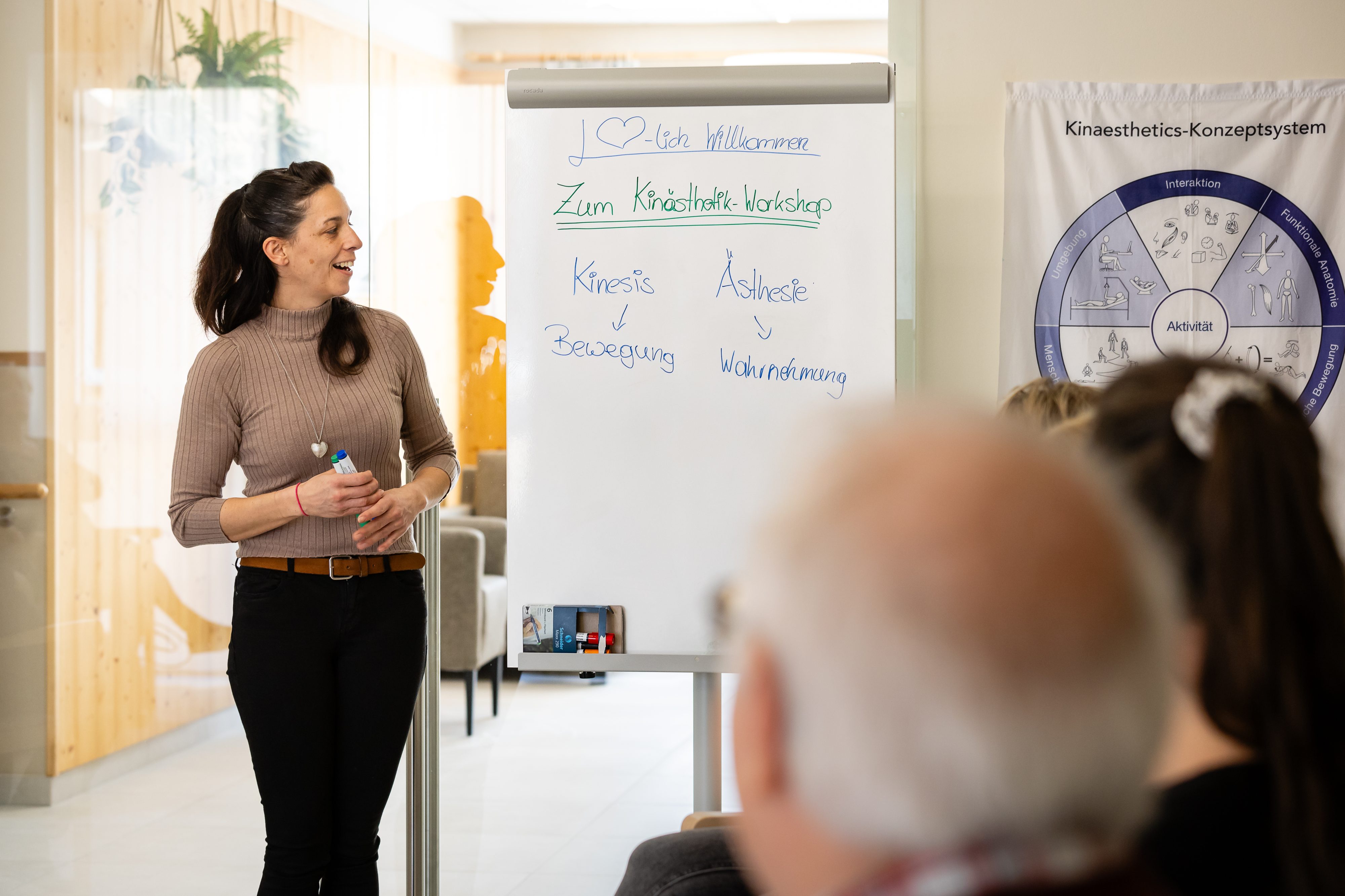 Zu Beginn wurde das Konzept der Kinästhetik erläutert und ausgeführt. Anschließend bekamen die anwesenden Teilnehmer*Innen die Gelegenheit, das Erlernte für verschiedenen Alltagssituationen, wie z.B. Sturzgeschehen, Mobilisation vom Rollstuhl ins Bett, Hilfestellung beim Aufstehen und Hinlegen, im Sinne der Kinästhetik zu üben.
