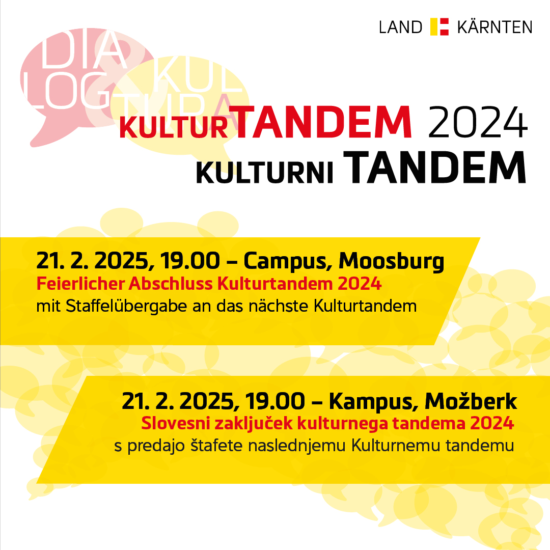 Nach rund acht Monaten mit zahlreichen geglückten Begegnungen, verabschiedet sich nun das Kulturtandem/Kulturni tandem 2024 am 21. Feber 2025 um 19.00 aus Moosburg/Možberk und Eisenkappel-Vellach/Železna Kapla-Bela.