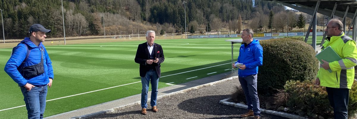 Die elastische Tragschichte wurde erneuert, die Kunstrasenbahnen verlegt und der Rasen mit Quarzsand und Granulat verfüllt. Die letzten Fertigstellungsarbeiten am Platz werden diese Woche vorgenommen. Bis Ende März werden noch Außenarbeiten durchgeführt und Anfang April die inneren Aufschließungswege asphaltiert. „Die bauausführenden Firmen haben sehr gut gearbeitet. Der Kunstrasen kann in wenigen Tagen im Einklang mit den Covid-Bestimmungen bespielt werden“, sagte Bürgermeister Herbert Gaggl anlässlich der Baubesprechung am Montag.