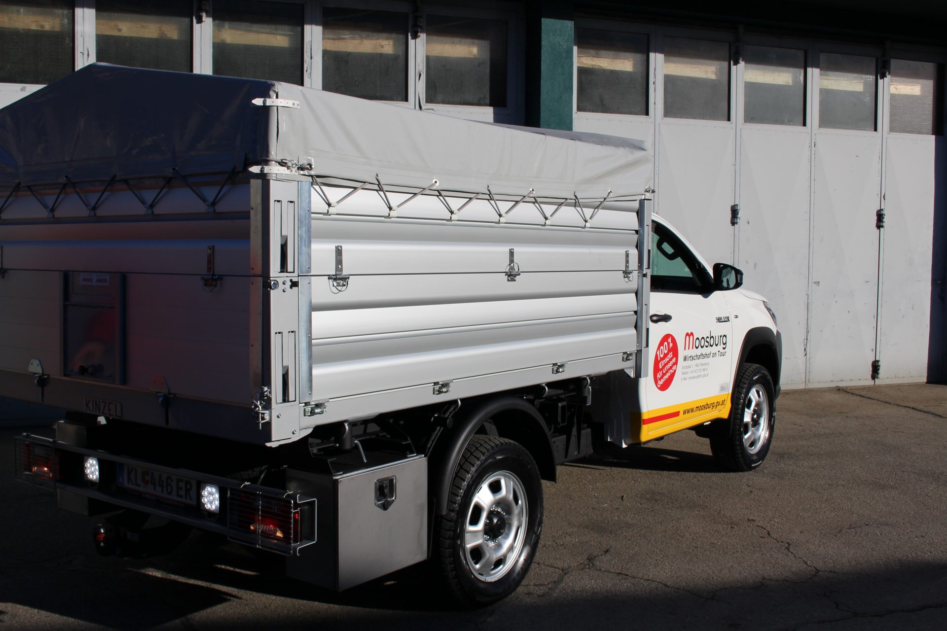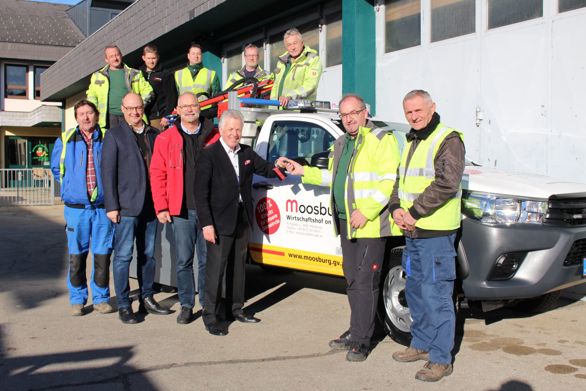 Der Toyota Hilux vom Autohaus Kinzel, Klagenfurt, extra für die kommunalen Bedürfnisse adaptiert, ersetzt den Mazda-Pritschenwagen. „Dieses Fahrzeug brauchen wir dringend, damit wir unsere Aufgaben sicher erfüllen können“, sagte Wirtschaftshofleiter Hermann Koraschnig. Groß war die Freude bei der Übernahme! Autohaus-Chef Ferdinand Kinzel, Werkstättenleiter Wolfgang Kattnig, Bgm. Herbert Gaggl, Wirtschaftshofleiter Hermann Koraschnig mit Team (vl)