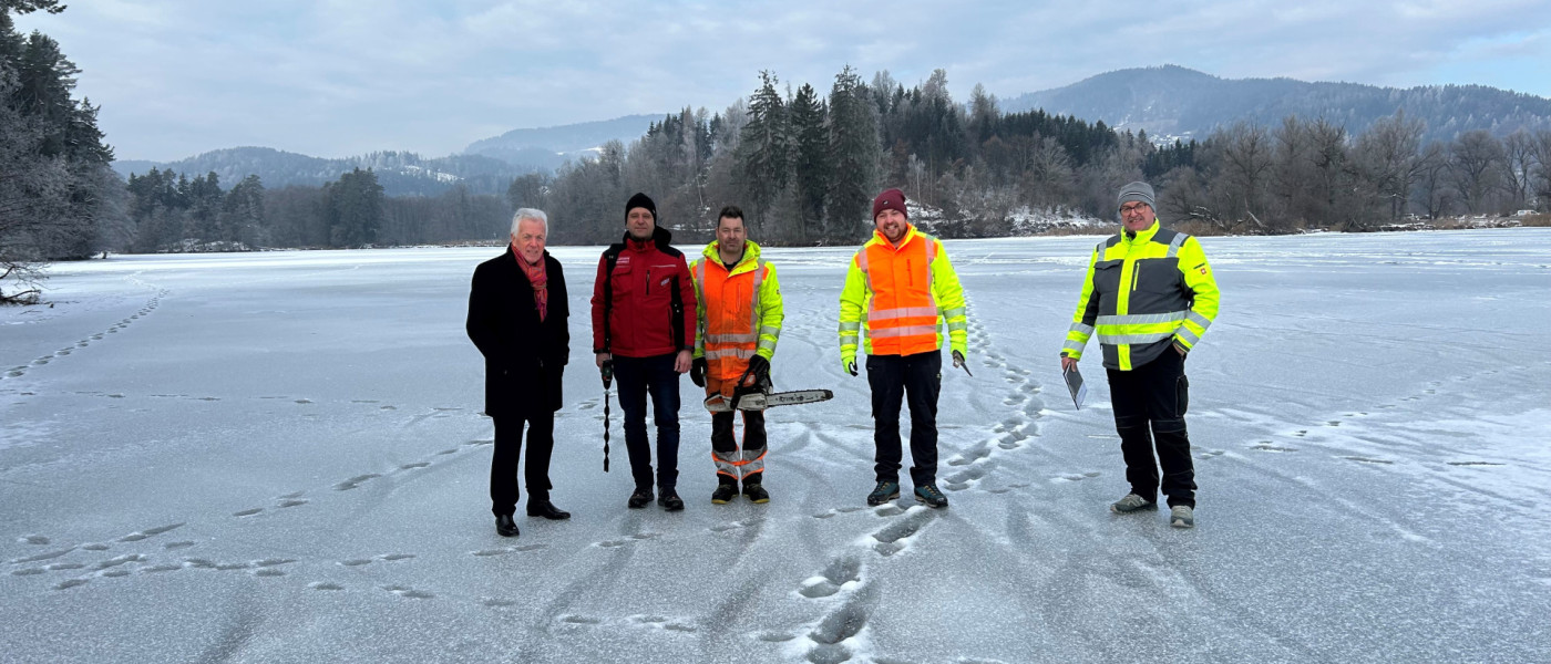Am Freitag, den 23. Jänner fand ein Ortsaugenschein statt, beim dem Bürgermeister Herbert Gaggl, Amtsleiter Norbert Pichler, Wirtschaftshofleiter Hermann Koraschnig, Wassermeister Daniel Schuss, der Obmann des Eislaufvereines Wörthersee, Mag. René Riepan und Mitarbeiter des Wirtschaftshofes teilgenommen haben. „Wir wollten aufgrund der tiefen Temperaturen den Teich zum Eislaufen und für sonstige Aktivitäten freigeben. Leider ist das nicht möglich“, informiert Bürgermeister Herbert Gaggl.