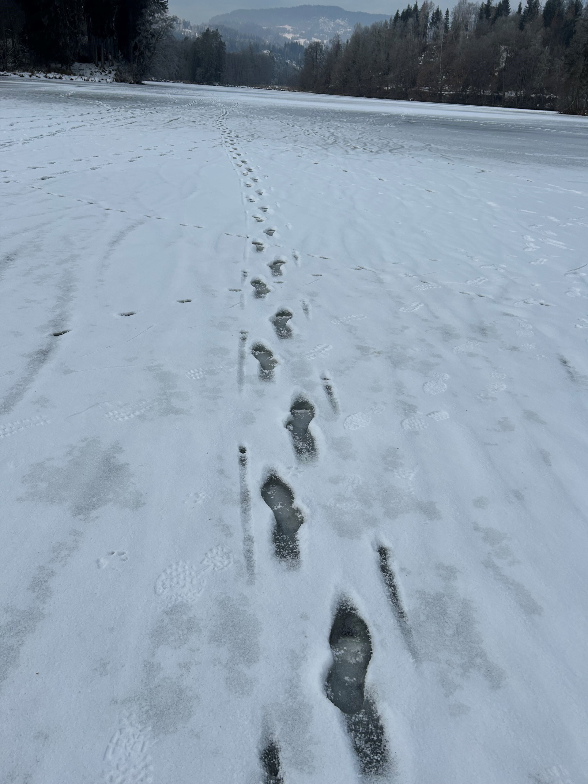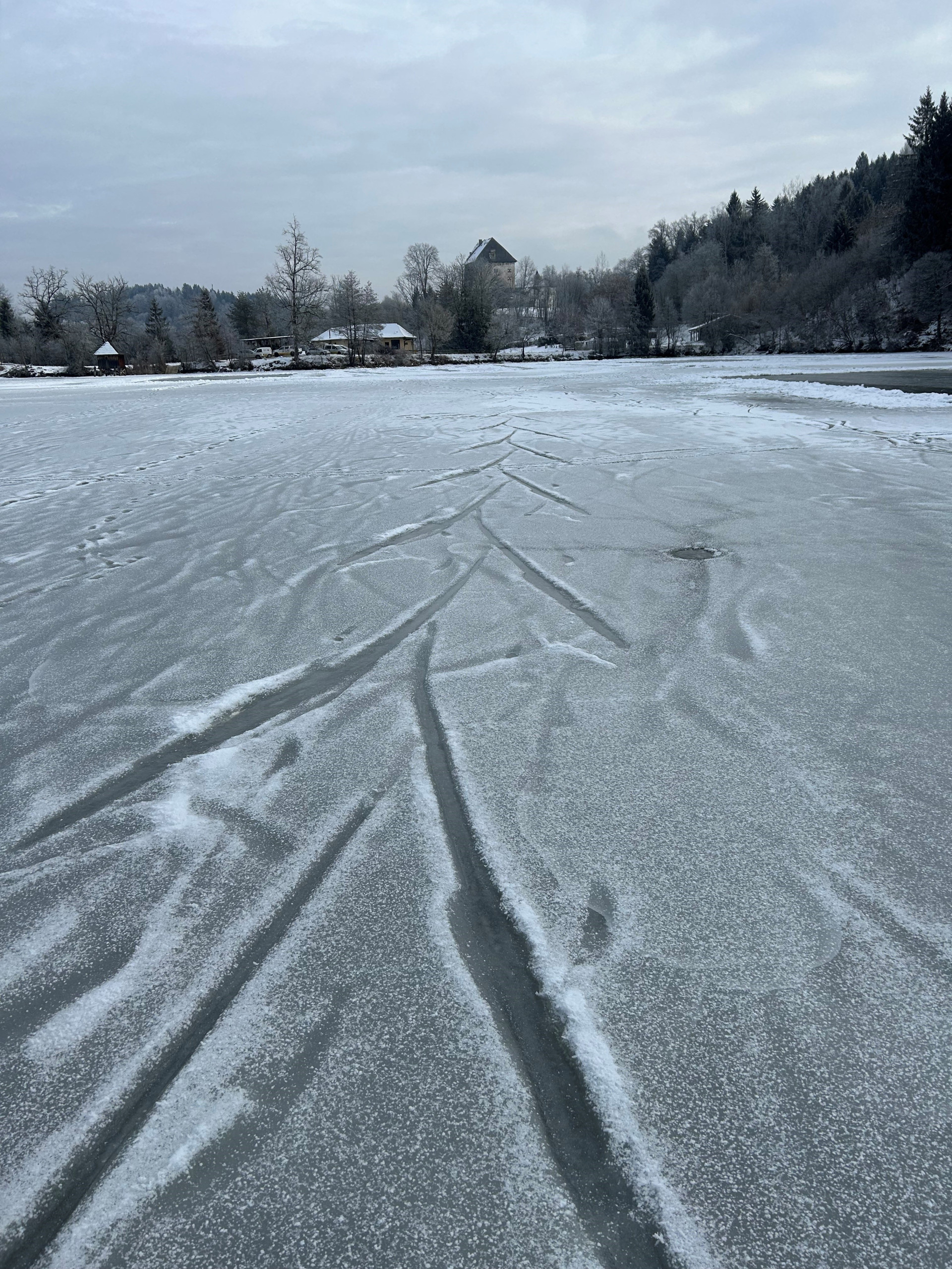 Der Teich wurde mit einer Drohne beflogen, um einen Gesamtüberblick über die Beschaffenheit des Eises zu erhalten. Zusätzlich wurden Löcher gebohrt, um die Eisstärke zu bestimmen. Mit der Motorsäge wurde ein Eisblock herausgeschnitten. Die Eisbeschaffenheit ist demnach nicht optimal. Die Witterung hat in den letzten Wochen immer wieder gewechselt. Kalt, warm und Schneefall. Die Kerneisschichte beträgt aufgrund der Messung nur 7 cm und es wurden Löcher im Eis festgestellt.