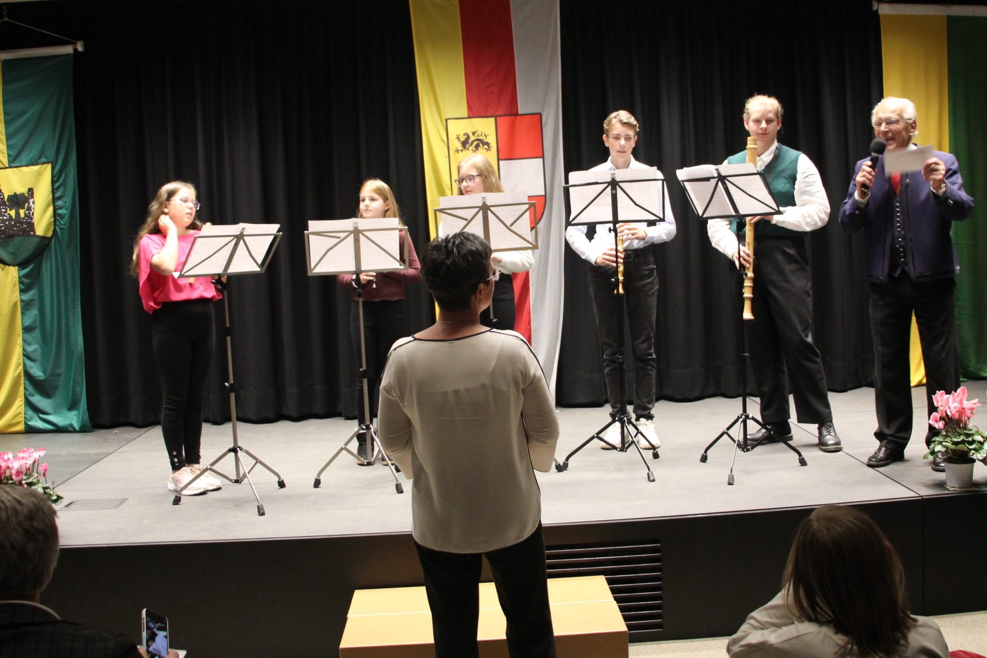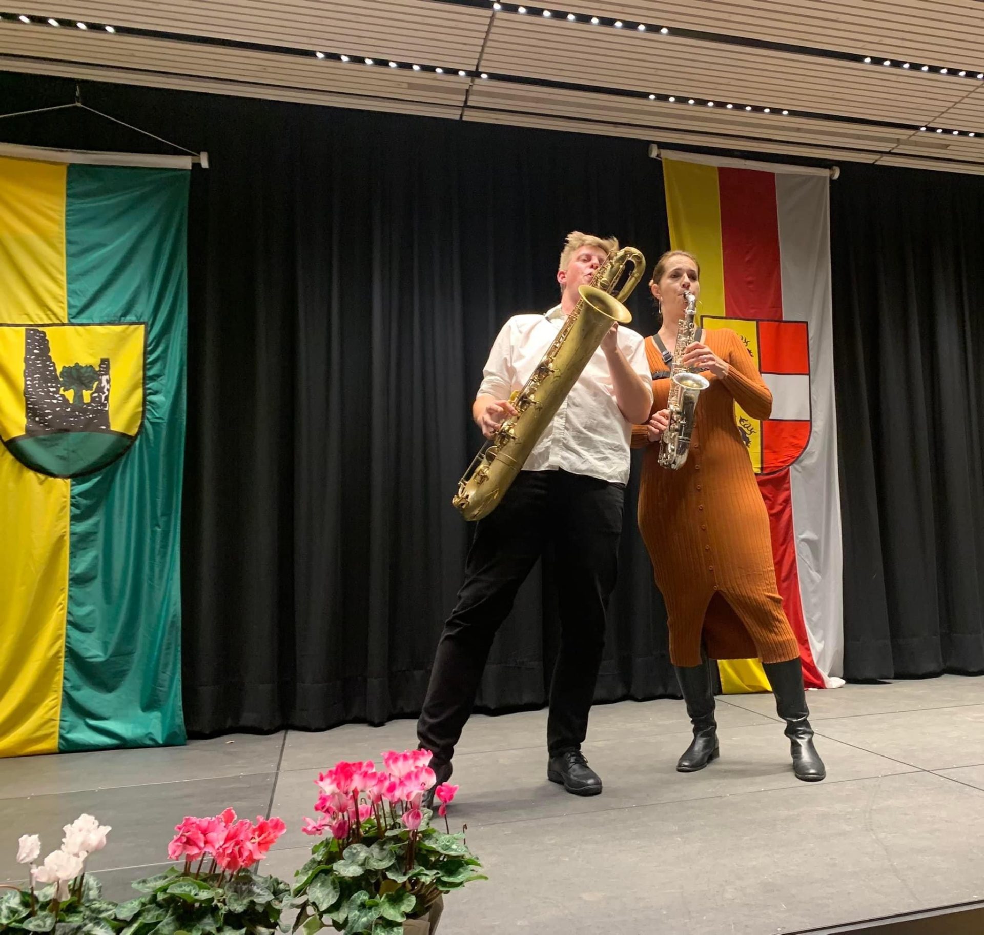 LAbg. Bürgermeister Herbert Gaggl freute sich gemeinsam mit den Akteuren über das zahlreich erschienene Publikum. Er bedankte sich bei der Ideengeberin und Initiatorin für das Projekt – Marianne Wulz – sowie bei allen aktiv an diesem Projekt Mitwirkenden. Eine besondere Einlage gab es über seine Anregung außerhalb des Programms nach der Pause von Stefan Lerchbaumer mit Alexandra Lassnig Walder am Saxofon. Dies demonstrierte beispielhaft, welche jungen musikalischen Spitzentalente Moosburg hervorzubringen imstande ist.