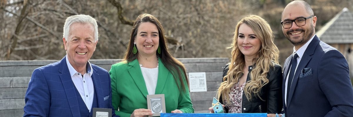 Am Bild sehen Sie Sternenbank-Namensgeber John Patrick Platzer, Wandelstern-Obfrau Bernadette Hartl und die Bürgermeister Herbert Gaggl (Moosburg) und Silvia Häusl-Benz (Pörtschach).