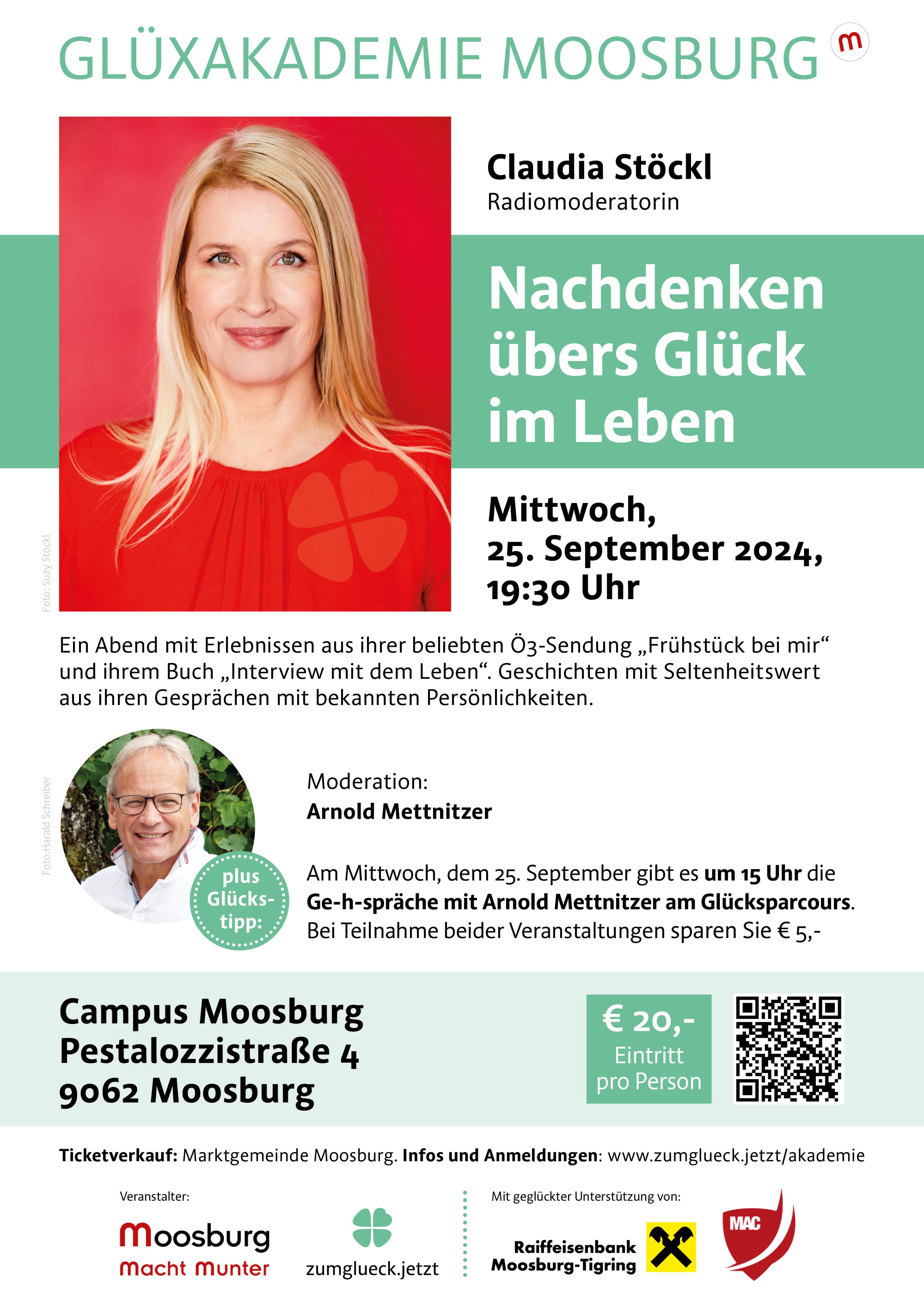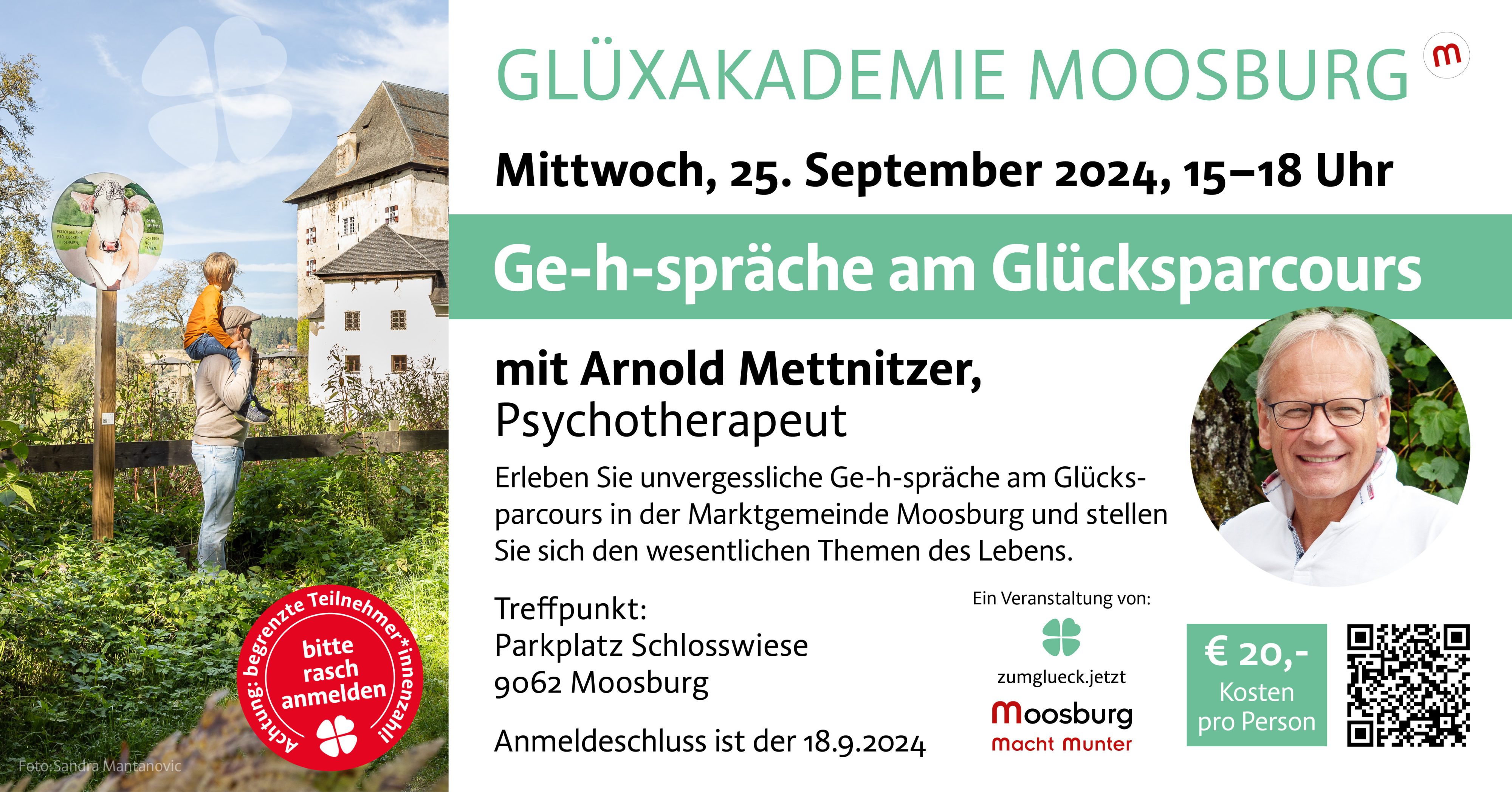 Zuvor, von 15 bis 18 Uhr finden die Ge-h-spräche am Glücksparcours mit Dr. Arnold Mettnitzer statt.