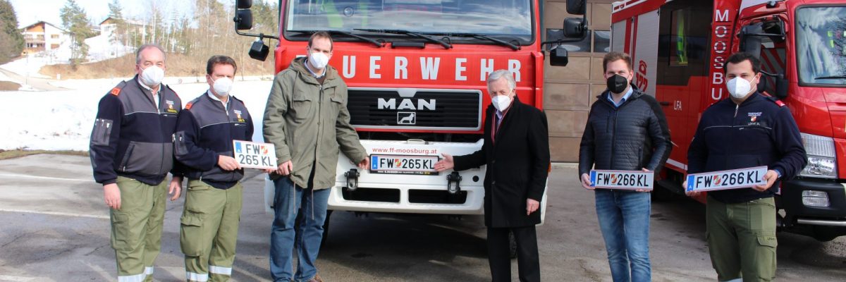 Dank Sponosor Michael Eiper, der die Ummeldung bezahlte, wurden die Fahrzeuge der FF Moosburg bereits jetzt mit den neuen Kennzeichen versehen, die mit FW und dem Hoheitszeichen der Feuerwehr beginnen. „Es ist ein Auftritt nach Außen und wir freuen uns, dass wir bereits jetzt diese Kennzeichen haben“, so Kommandant Thomas Duss.