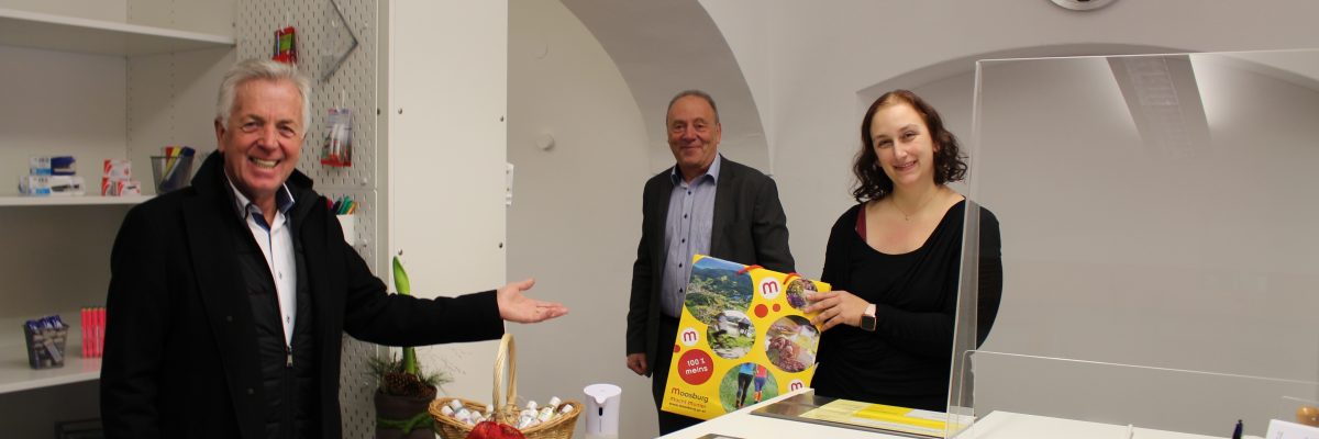 Bürgermeister Herbert Gaggl heißt die neue Postpartnerin in Moosburg Willkommen und freut sich mit Verkaufsleiter Alfred Scherr über die neuen Räumlichkeiten.