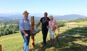Peter Winkler und Claus Jessenitschnig haben am Verbindungsweg Nußberg – Krainig einen Rastplatz gestaltet. Der wunderschöne Blick über Moosburg bis hin zu den Karawanken lädt zum Verweilen ein. „Dieser Platz ist wunderbar. Ich bin jeden Tag hier“, sagt Christel Jessenitschnig. Foto: Peter Winkler, Claus Jessenitschnig, Christel Jessenitschnig
