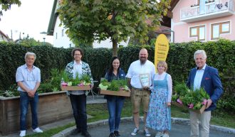 Gartenkräuter veredeln die Speisen und verströmen einen wunderbaren Geruch. Aus Anlass der diesjährigen Blumenolympiade war der Innungsmeister der Kärntner Gärtner, Bernhard Wastl, zu Gast in Moosburg zeigte, wie man Kräuter und Blumen richtig einsetzt. Den biologischen Dünger aus Schafwolle steuerte Schafbauer Thomas Koch bei. Foto: Bernhard Wastl, 2.Vbgm. Roland Gruber, 1. Vbgm. Astrid Brunner, Fam. Koch, Bgm. Herbert Gaggl vl