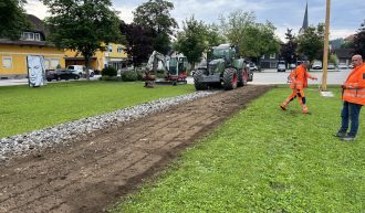 In der Schlosswiese im Zentrum von Moosburg wurde ein Schotterrasen errichtet. „Bei Veranstaltungen gab es immer wieder Probleme mit der Erhaltung der Rasenfläche. Vor allem bei Regen war eine Nutzung nur schwer möglich. Mit dem Schotterrasen sollte das Problem gelöst sein. Fahrzeuge können darauf fahren und Gerätschaften können auf- und abgebaut werden“, erläutert Bürgermeister Herbert Gaggl. „Mit dem Bauleiter von Swietelsky, Günther Gfrerer, haben wir nach einer Lösung gesu…