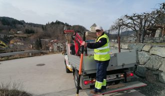 In den letzten Wochen wurden von den Mitarbeitern des Wirtschaftshofes die Schneestangen eingesammelt. Über 3.500 Stangen wurden von den Straßenrändern entfernt, gesäubert, gewartet und ordnungsgemäß verstaut. „Es ist viel Arbeit. Aber wir schauen auf unsere Sachen. Denn der nächste Winter kommt bestimmt“, sagt Wirtschaftshofleiter Hermann Koraschnig. Foto: Mitarbeiter Josef Auer beim Einsammeln der Schneestangen.