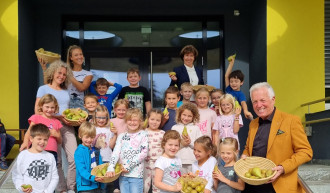Anlässlich der Zertifizierung „Gesunde Küche“ des Kindergartens Moosburg versprach Bürgermeister Herbert Gaggl Schokolade für alle Kids. „Was ich den Kindern verspreche, das halte ich auch“, so der Bürgermeister und stellte sich mit den süßen Köstlichkeiten ein. Die Kinder hatte eine große Freude.