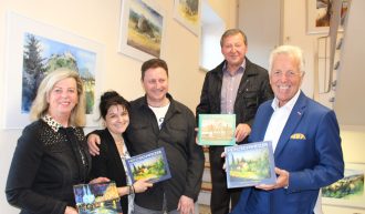 Der Verein zur Förderung zeitgenössischer Kunst zeigt Aquarelle von Heinz Schweizer. „Heinz Schweizer ist ein wahrer Könner. Ich freue mich sehr, dass er in Moosburg ausstellt“, informiert Kuratorin Edeltraud Obersteiner. Die Ausstellung wurde am Montag, dem 6. Mai 2019 durch Bürgermeister Herbert Gaggl eröffnet. Foto v.l. Vzbgm. Hermine Kogler, Margit und Heinz Schweizer, Vzbgm. Ekart Schwarzfurtner, Bgm. Herbert Gaggl