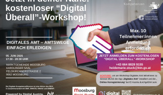 Wollen auch Sie zukünftig Ihre Amtswege online erledigen? Dann melden Sie sich jetzt für den kostenfreien Workshop an und entdecken Sie die digitale Welt der österreichischen Behördendienste. Der interaktive Workshop führt Sie durch die Funktionen der App Digitales Amt. Sie werden dabei interaktiv begleitet, verschiedene Anwendungen auszuprobieren: Nutzen Sie die Vorteile der digitalen Unterschrift, erhalten Sie Behördenschreiben elektronisch, und führen Sie Ihren Führerschein auf dem Smartphon…