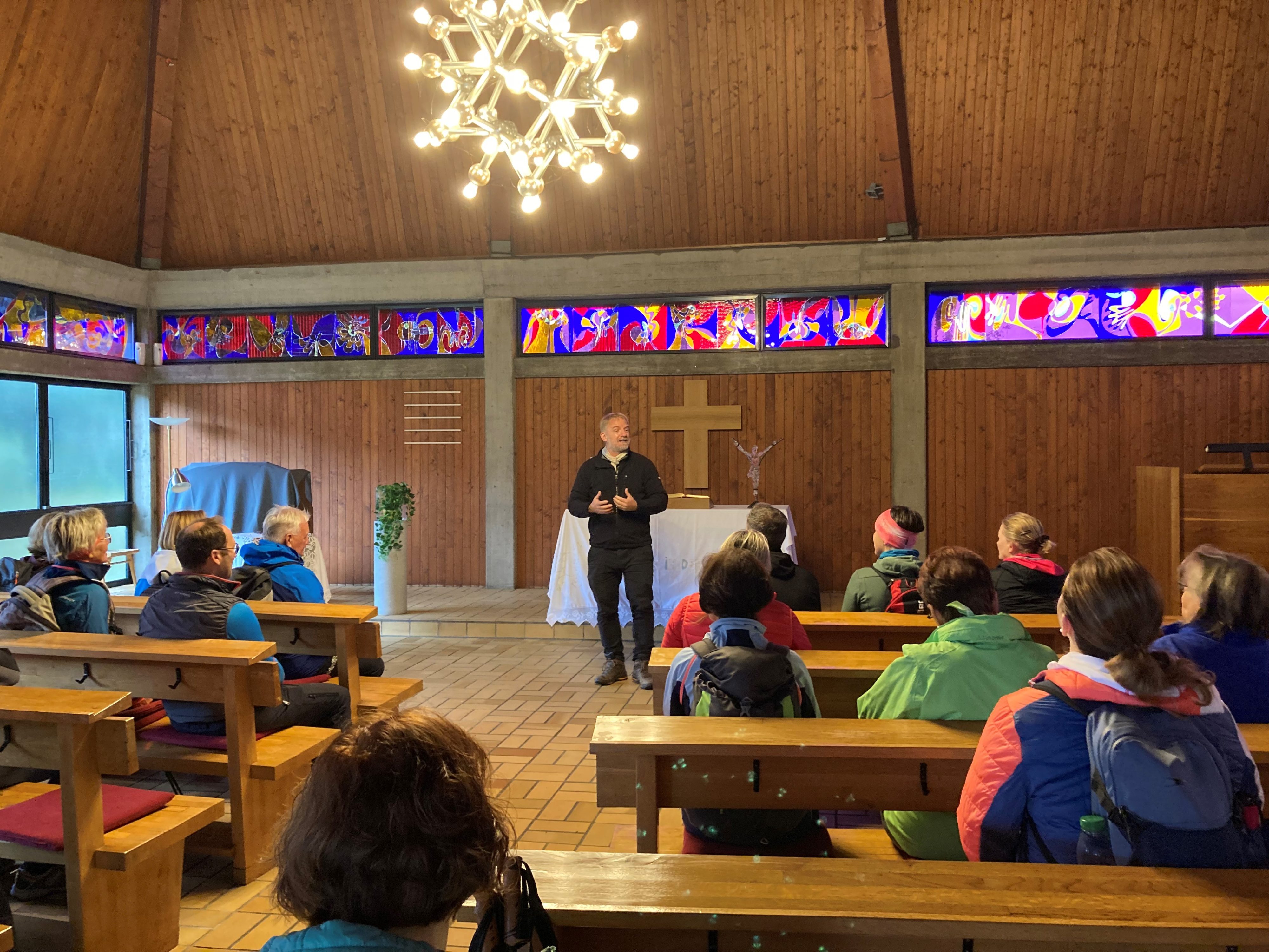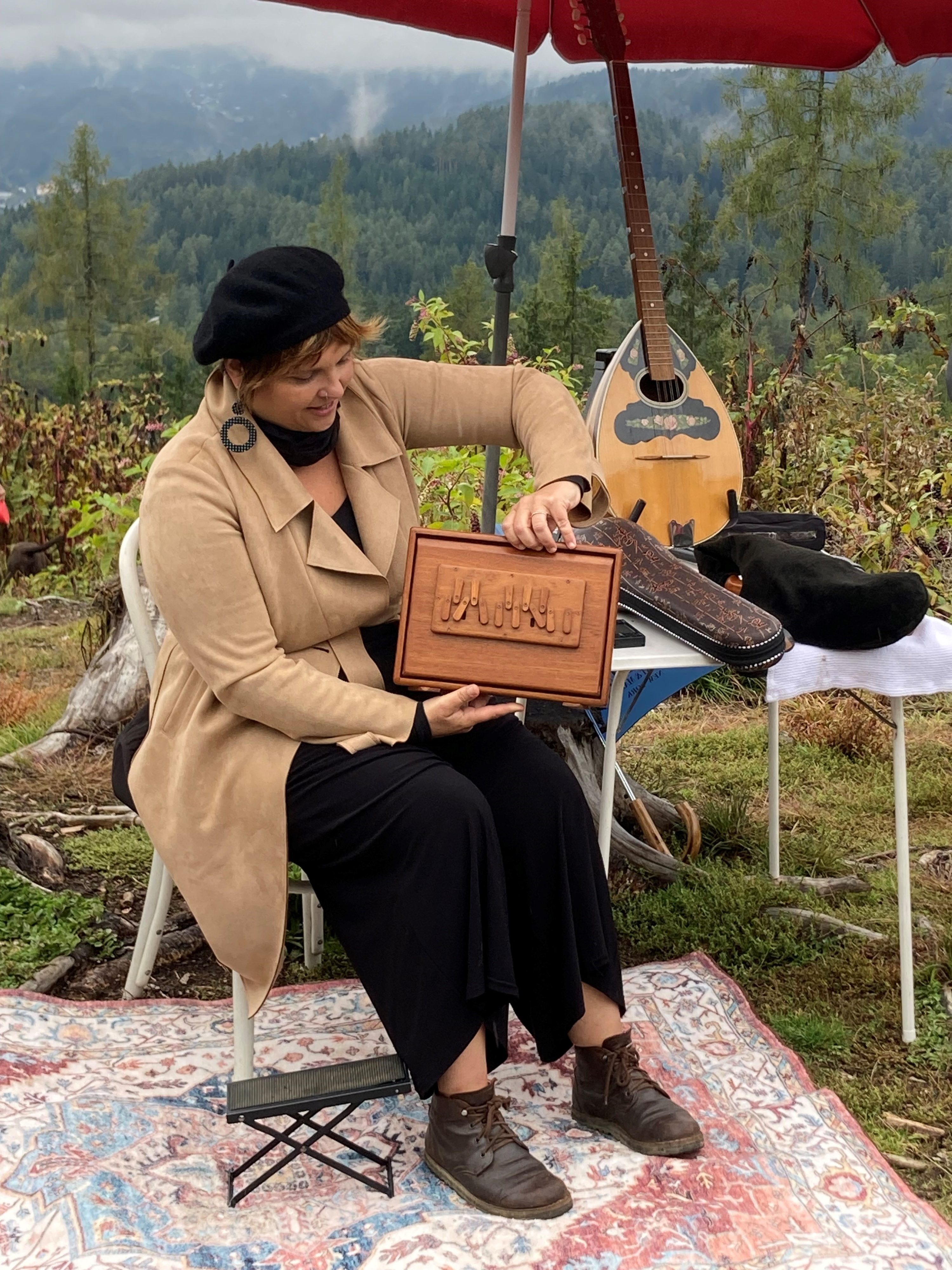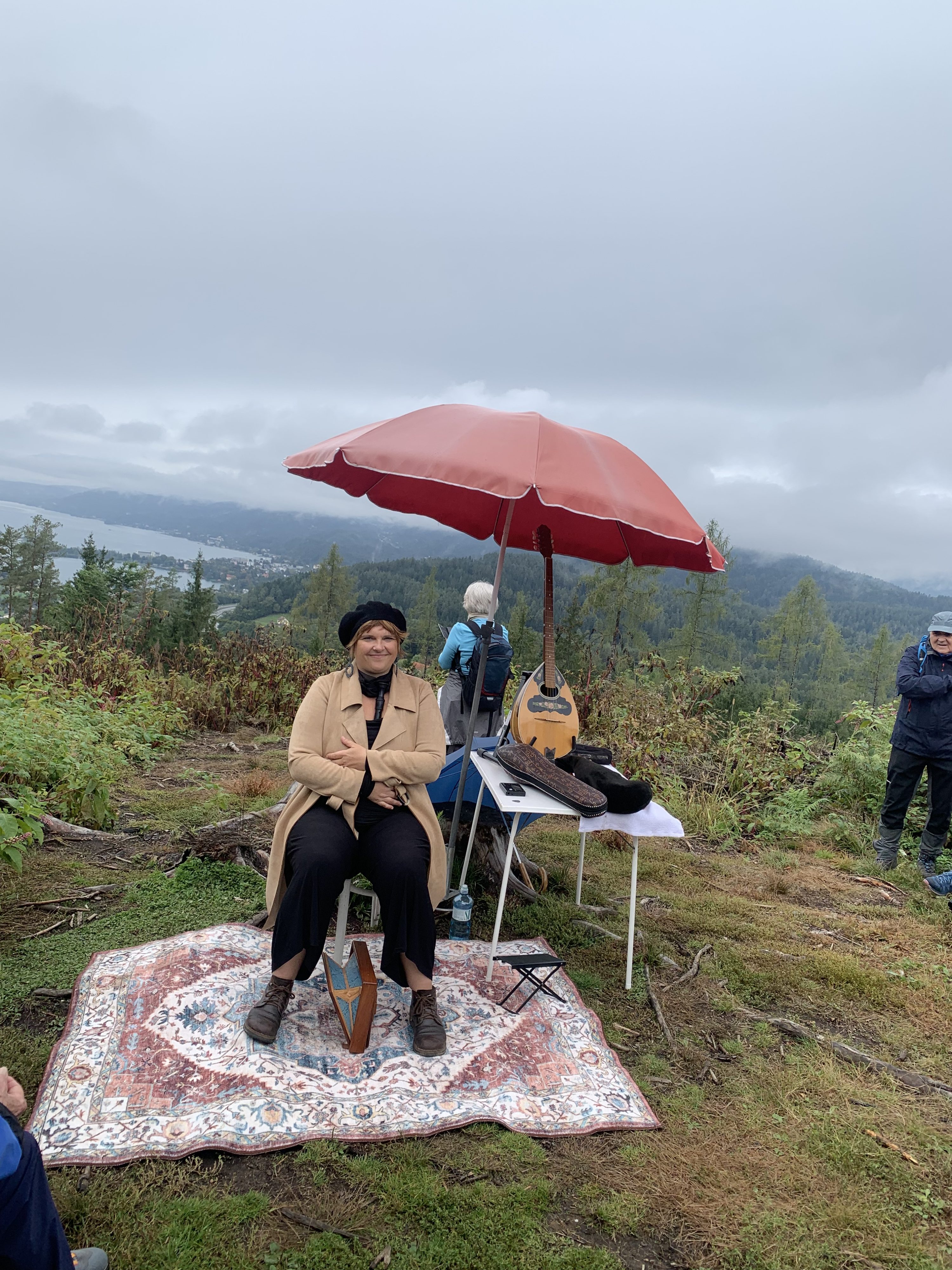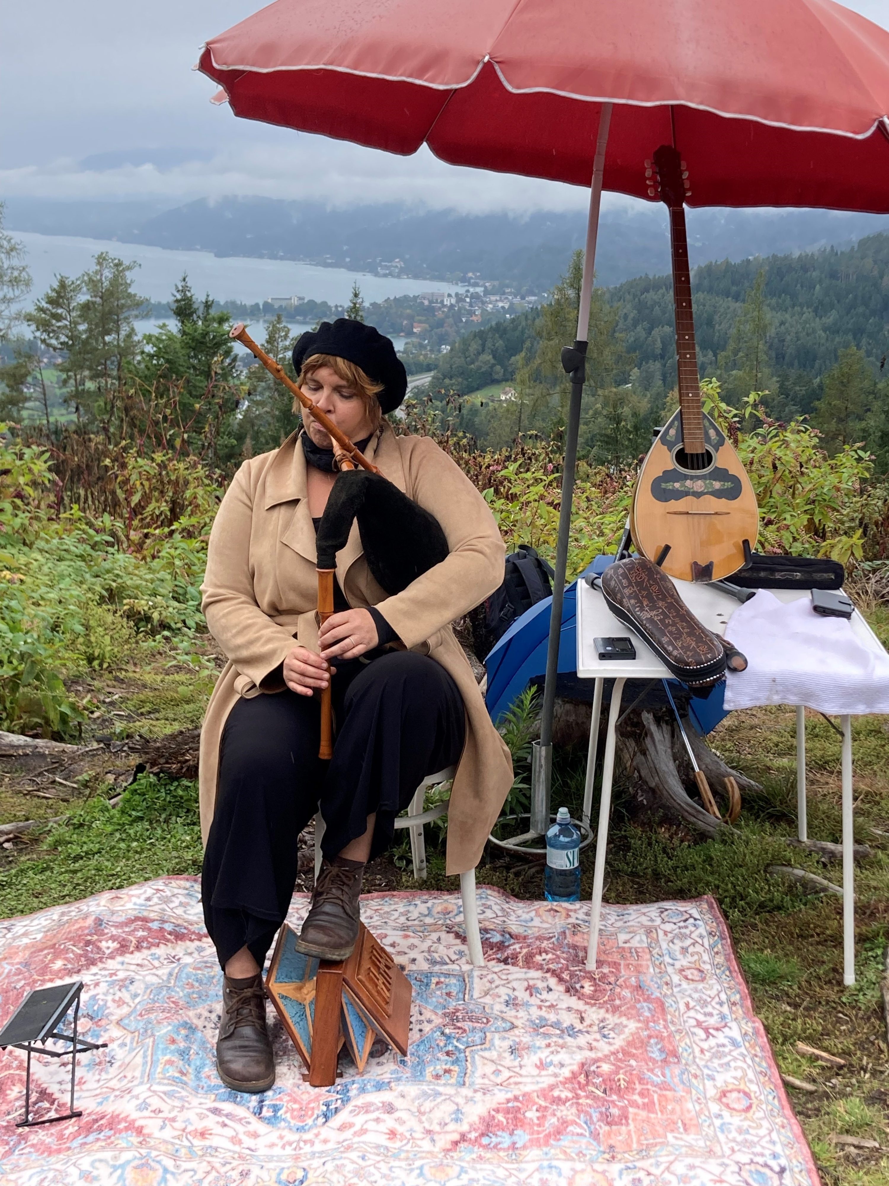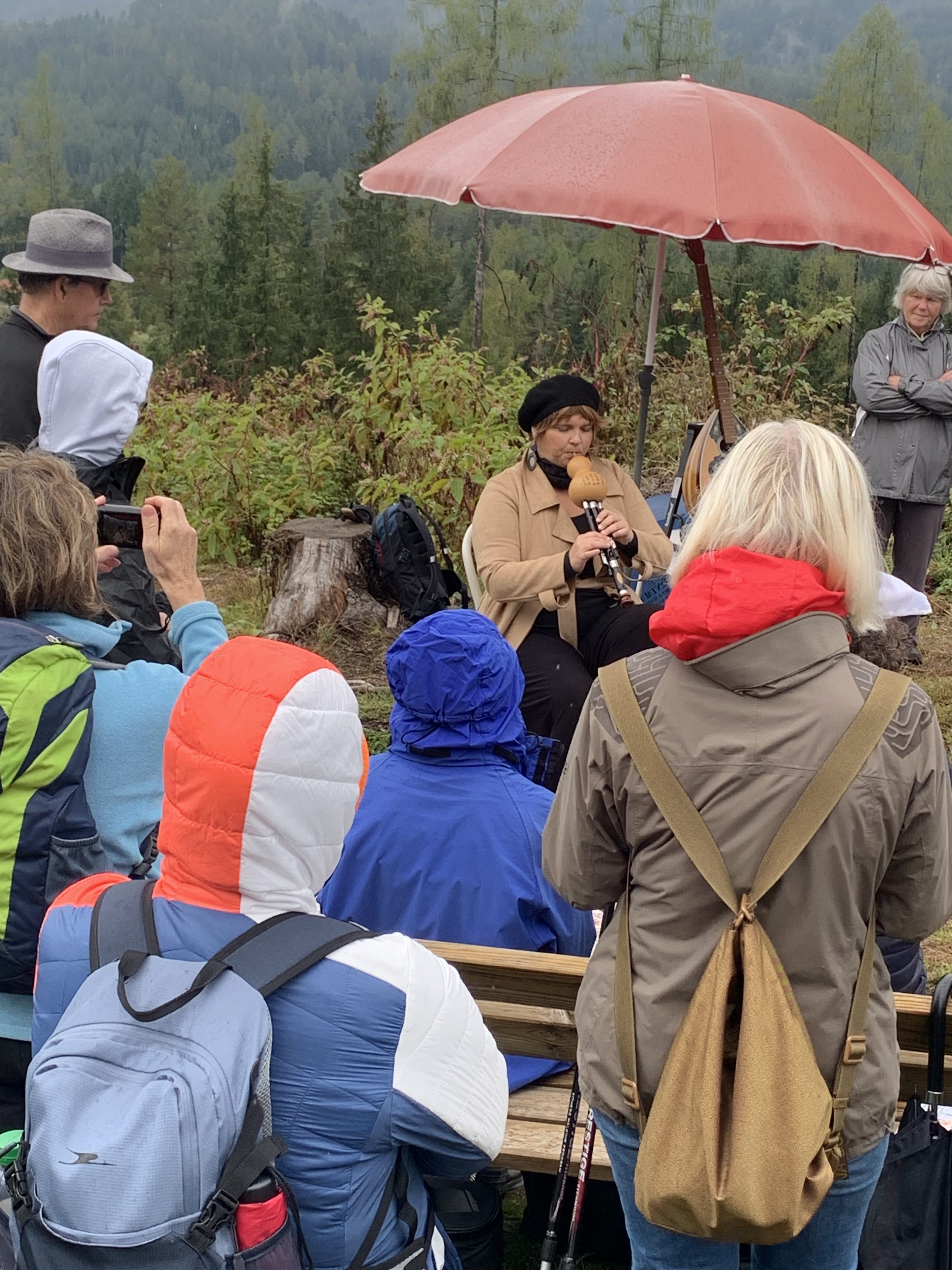 Rund 50 wetterfeste Wandersleute aus den drei Gemeinden ließen sich auch vom tiefgrauen Himmel nicht abschrecken und trafen sich morgens bei der evangelischen Kirche in Krumpendorf zur Einstimmung bei einem gemeinsamen Frühstück. Pfarrer Martin Madrutter lud bei dieser Gelegenheit zu einer kurzen Besichtigung der Kirche und erzählte ein paar Worte über deren Geschichte. Danach marschierte man Richtung Görtschach, wo beim Gasthof Pisl schon eine kleine Jause wartete. Nach der Stärkung führte die Strecke über Drasing und Pirk auf den Pirkerkogel, wo – wie bereits traditionell bei der Sternwanderung – eine musikalische Überraschung auf die Wandersleute wartete. Die Musikerin, Sängerin und Multi-Instrumentalistin Corina Kuhs verzauberte die ZuhörerInnen mit Klängen verschiedener Flöten, Gitarren und der Shruti-Box.