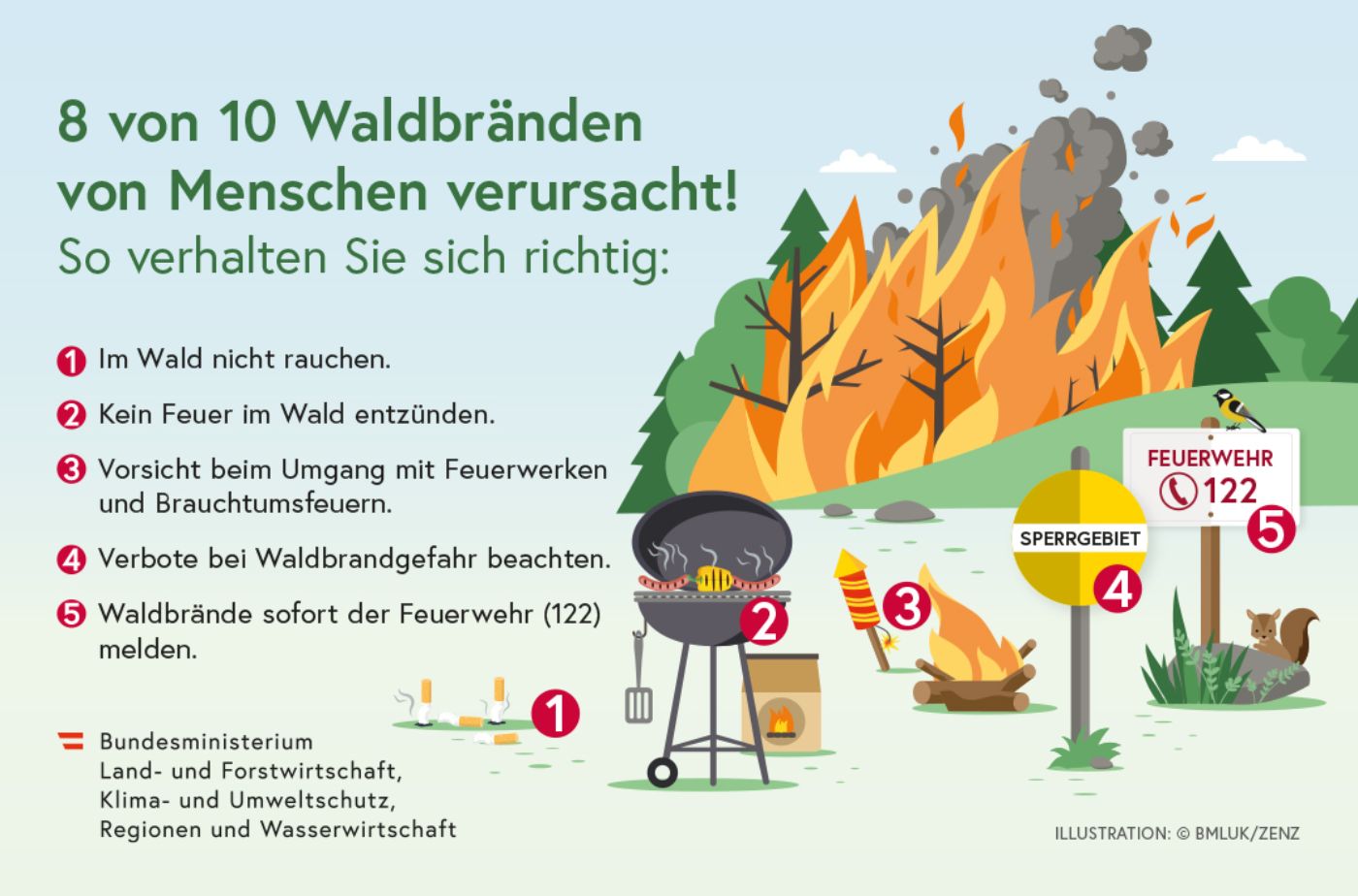 1. Waldbrände sofort der Feuerwehr (122) melden. 🚒