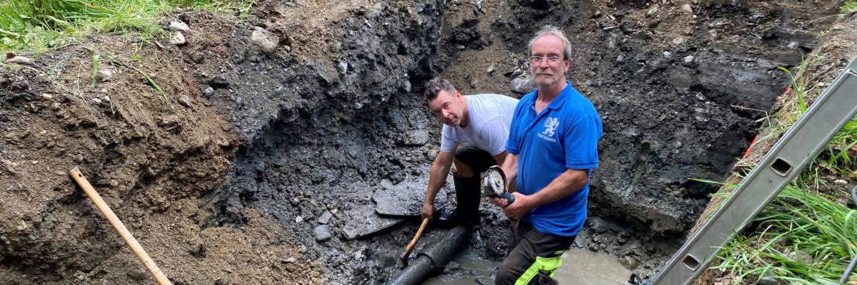 Auf dem Nachhauseweg, am Freitag Nachmittag,  fiel Fritz Pirker eine nasse Fläche am Witscher Weg auf. „Das kann nicht sein, dass bei Trockenheit Wasser aus dem Erdreich kommt“, dachte sich der aufmerksame Anrainer und verständigte Amtsleiter Norbert Pichler, der den Wasserwerk-Bereitschaftsdienst aktivierte.