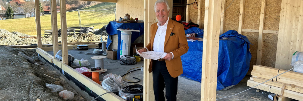 Bürgermeister Herbert Gaggl: „Ich freue mich über den Baufortschritt des Gastronmiegebäudes auf der Schlosswiese. Wenn alles passt, eröffnen wir heuer im Juni.“