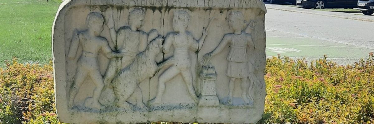 Votivrelief an Nemesis mit Gladiatoren (Bestiariern) – Weihung für Nemesis